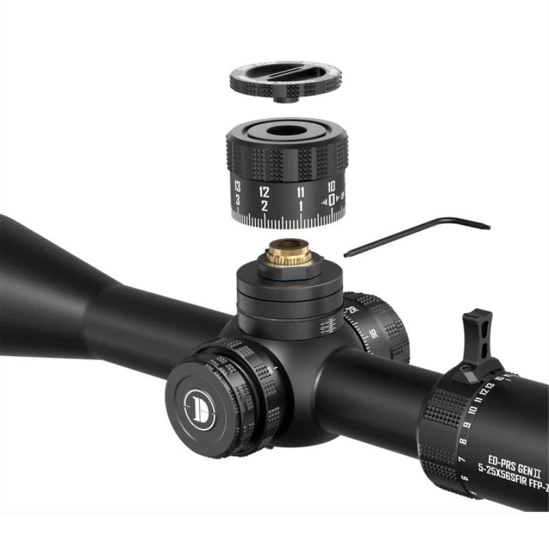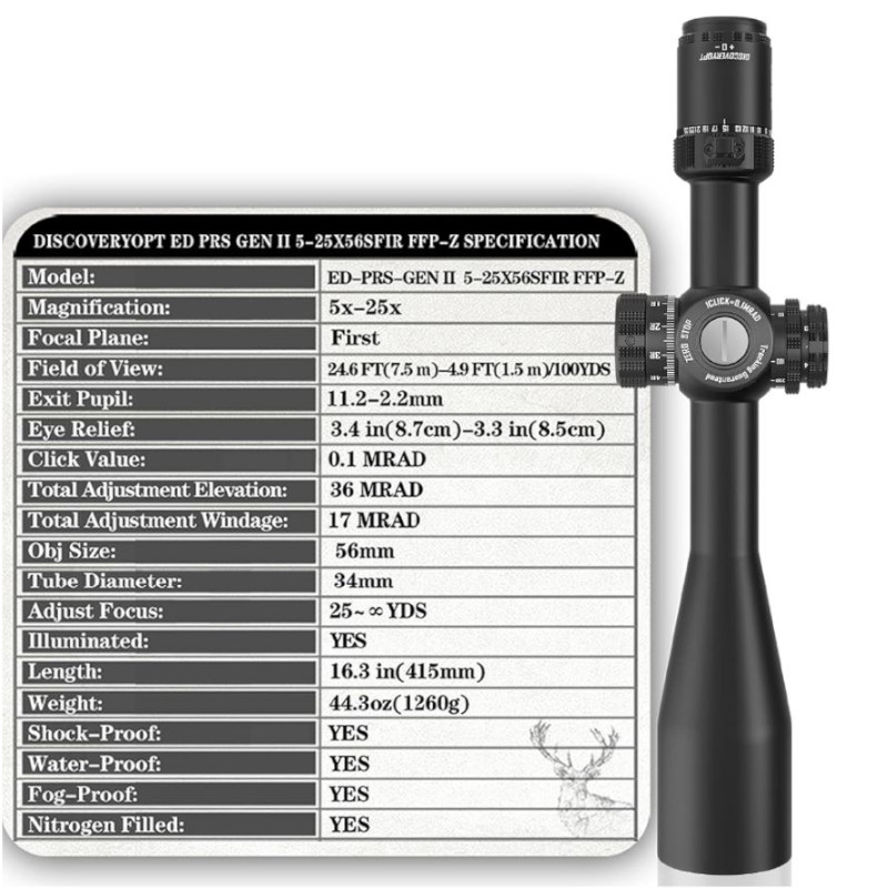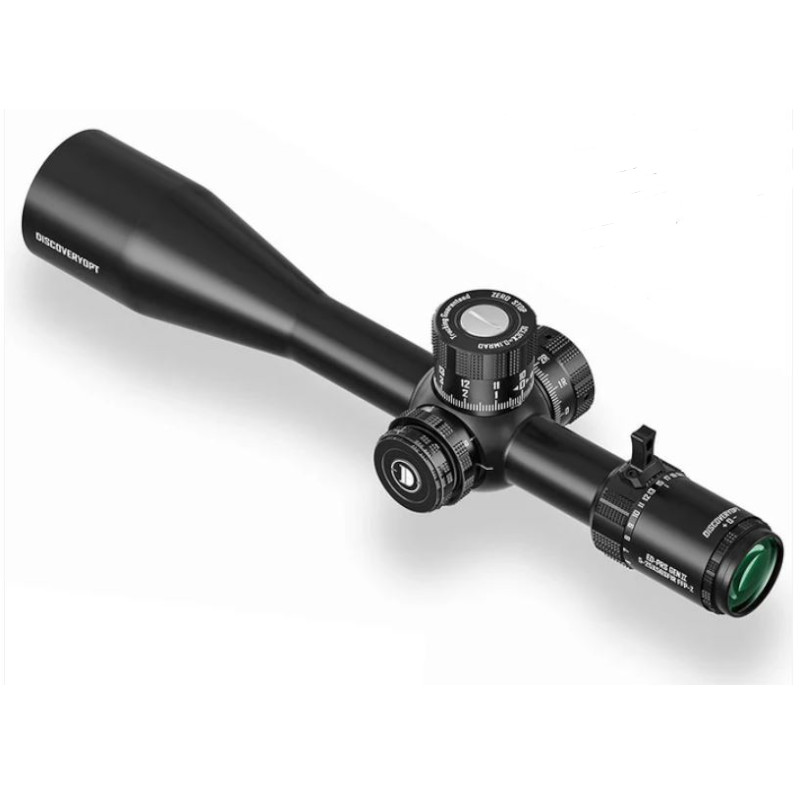 Discovery Optics è un’azienda che dal 2009 produce ottiche ad alte prestazioni, grazie anche all’utilizzo delle lenti ED della giapponese Hoya Corporation. Queste lenti offrono immagini molto nitide, senza aberrazioni cromatiche, riproducendo i colori in modo realistico. La bassa dispersione e i trattamenti multistrato, garantiscono immagini di ottima qualità e dettagliate anche utilizzando alti ingrandimenti. Le torrette, di dimensioni piuttosto importanti, con click da 0,1 MRAD, hanno un’escursione di 36 MRAD in elevazione e 17 MRAD in deriva. Il reticolo è posto sul primo piano focale e la croce centrale è illuminata in rosso con 6 intensità differenti. Il funzionamento avviene tramite batteria CR2032. La funzione zero-stop consente un ritorno immediato alla distanza di azzeramento. La ghiera della parallasse va da 25 Yds all’infinito. Rispetta la specifica waterproof IP67. La dotazione comprende il parasole, i flip cap, il kit per mettere in bolla l’0ttica e lo spazzolino per la pulizia delle lenti.