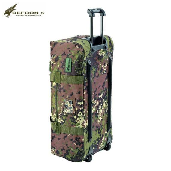 Il trolley militare DEFCON 5 è realizzato in tessuto 600 Denari, molto resistente all’usura e agli strappi, idrorepellente e proposto nella colorazione vegetato italiano. Composto da un vano principale centrale della capienza complessiva di 70 litri, su un telaio munito di ruote e fondo rigido. Inserti laterali in velcro per l’applicazione di targhette identificative. Una tasca esterna permette il trasporto di documenti o altro materiale. Spallacci imbottiti, regolabili tramite fibbie a scorrimento, consentono il trasporto tipo zaino, mentre due maniglie poste sul frontale permettono il trasporto come borsone. Dotato di maniglia anche nella parte superiore per brevi spostamenti. Ha un peso contenuto in soli 3,150 kg. Ideale sia per l’utilizzo professionale che per l’escursionismo quando necessitano grandi volumi di carico. Certificazione NATO (NSN/NUC 8465.15.19.34006).
